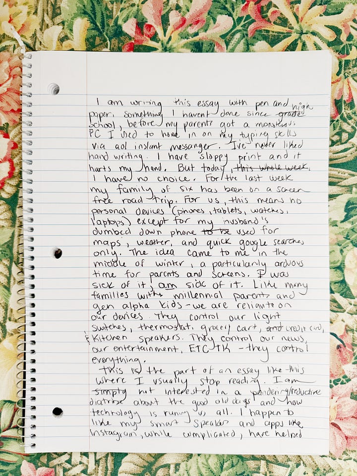 I’m writing this with pen and paper, something I haven’t done since high school, before my parents got a monstrous PC that I immediately used to hone in on my typing skills via AOL Instant Messenger. I’ve never liked handwriting. I have sloppy print and it hurts my hand. But today, I have no choice. For the past week, my family of six has been on a screen free road trip up the New England coast. For us, this means no personal devices (phones, tablets, watches, laptops, etc), except for my husband’s dumbed down phone, reduced to maps, weather, and yelp.